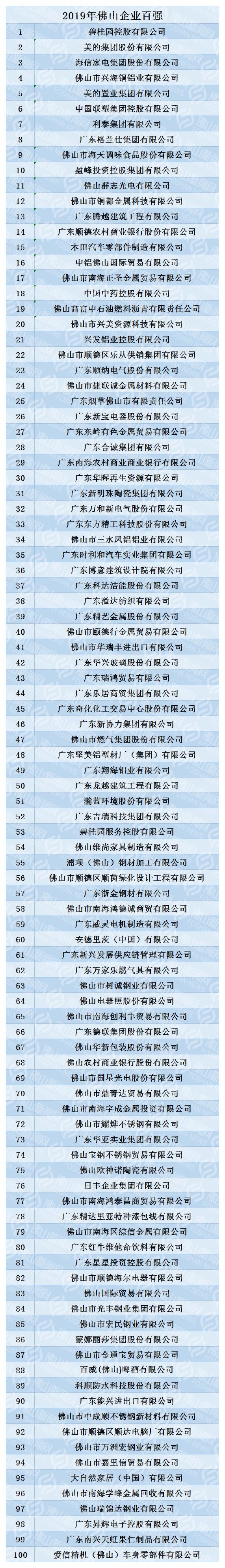 12月17日,佛山市企业联合会、佛山市企业家协会首次发布佛山企业100强榜单。该榜单以2018年企业营业收入为基本标准,综合考虑企业经营指标而得出。榜单的上榜门槛是27亿元,百强企业总营收达到13463.6亿元。
