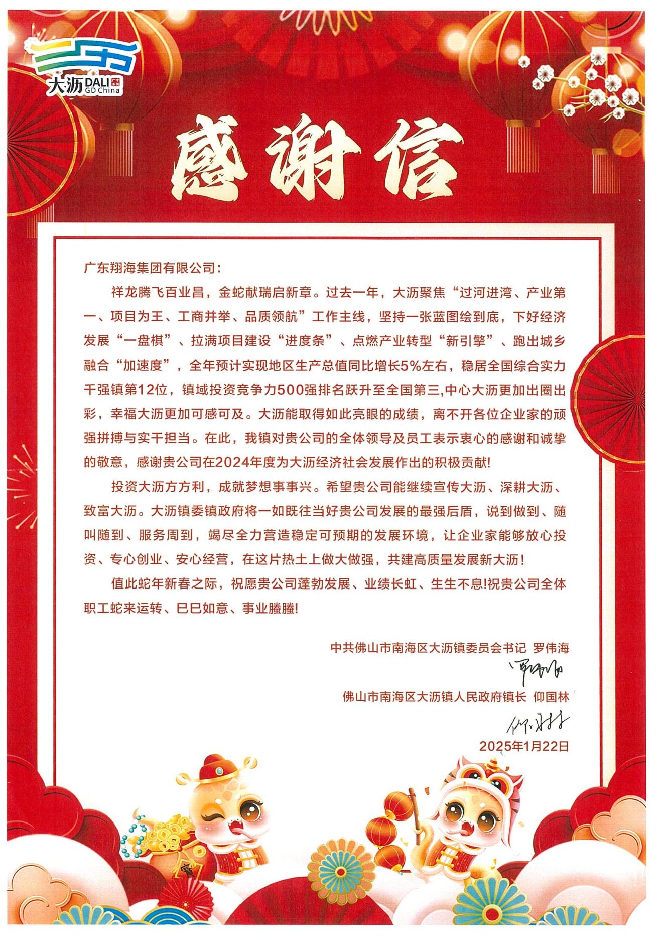 乐鱼网站web版深感荣幸,新春之际收到了一封来自大沥镇政府的感谢信。作为大沥的本土企业,我们深知企业的成长离不开当地政府和社会各界的支持与厚爱。在此,我们衷心感谢大沥镇委镇政府,感谢各位合作伙伴的鼎力支持和信任。